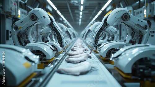 Fototapeta premium Robotic Assembly Line Processing Fish Products