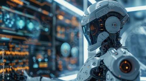 Fototapeta premium Robotic engineer controlling an advanced robot with a complex interface,...