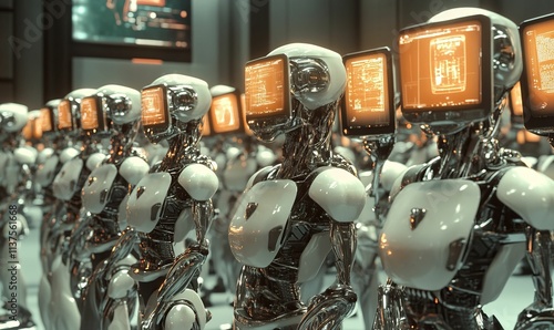 © jambulart, Fototapeta premium Robotic figures stand, screens illuminating faces.