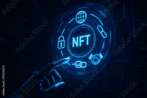 © Tech and Bussiness, Obraz premium Robotic Hand Interacting with Virtual NFT Interface in Digital Space