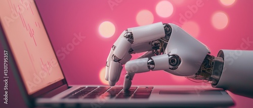 © Kiadtisak, Naklejka premium Robotic Hand Using Laptop Computer AI Technology Futuristic Pink Background