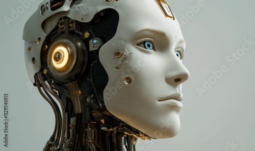 Fototapeta premium Robotic head, exposed mechanism, human-like face.