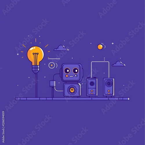 Obraz premium Robotic Innovation: A stylized illustration showcases a cute robot illuminating a lightbulb, representing creativity and technological progress on a striking, color-rich background.