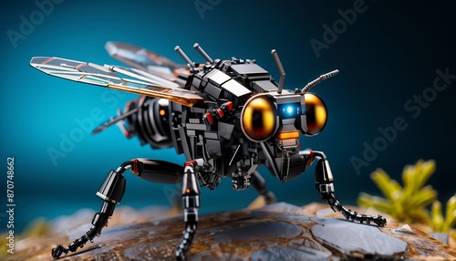 © Janis, Fototapeta premium Robotic insect with glowing eyes, close-up on nature background. Generative AI
