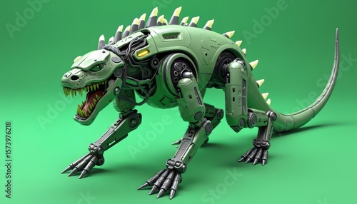 Obraz premium Robotic Lizard with Spikes on a Green Background