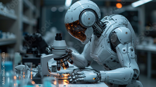 Fototapeta premium Robotic Scientist Using Microscope, AI in Laboratory Research, High-Tech Science