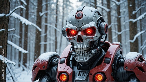 Fototapeta premium Robotic Skull in Snowy Forest.