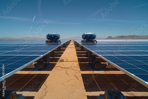 Obraz premium Robotic solar panel installers in a vast desert. Bright sunlight under a clear blue sky. Large scale solar farm. Automated efficiency.
