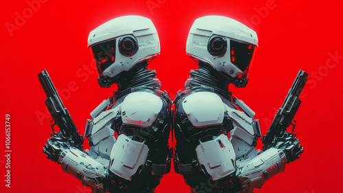 © Tahsin, Naklejka premium Robotic soldiers stand back to back, ready for action against a vibrant red background
