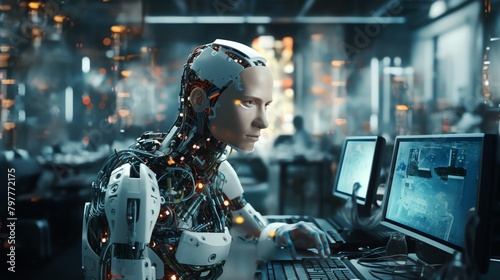 © nattapon98, Fototapeta premium Robotics developer in lab, testing new AI, cluttered, documentary style