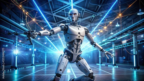 Naklejka premium Robotics Engineering A futuristic robot poses dramatically in a high-tech environment filled with vibrant lights.