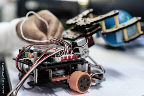 Obraz premium Robotics technology, STEM education lab learning coding study concept : Metal...