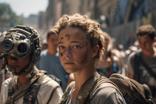 Fototapeta premium robots and humans as combat suits or artificial intelligence for war or as a futuristic future like dystopia. Generative AI