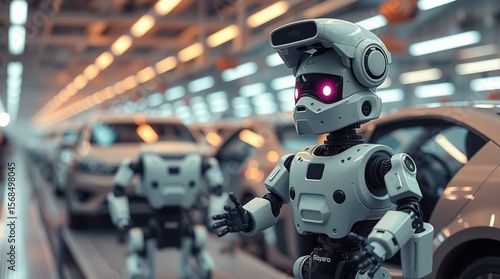 © Budiono, Fototapeta premium Robots assemble cars in factory line