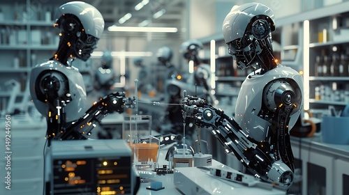 Fototapeta premium Robots collaborating in a laboratory setting, showcasing advanced technology...