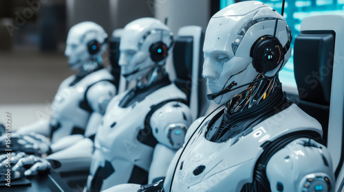 Fototapeta premium Robots engaged in complex tasks within a high-tech control room during a...