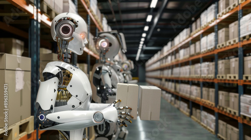 © ImageKing, Fototapeta premium Robots help manage warehouses, using technology to streamline operations and increase efficiency. They use artificial intelligence systems to automate tasks and improve productivity.