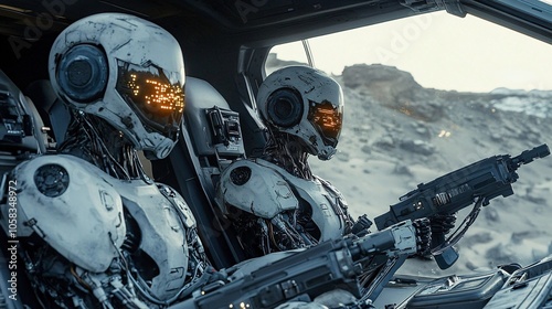 Obraz premium Robots in Cockpit Holding Weapons Close Up