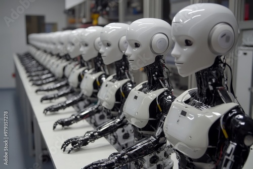© woters, Fototapeta premium Robots lined up in a futuristic laboratory showcasing advanced humanoid technology and robotic design in progress during daytime