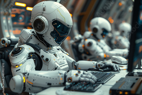 © lichaoshu, Fototapeta premium Robots working in factory with laptops