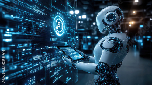 © fanjianhua, Fototapeta premium Robots working in front of screens