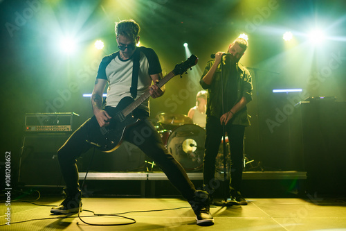 Fototapeta premium Rock band performing live on stage with energetic guitarist