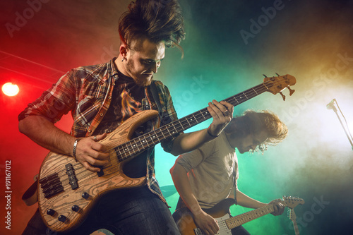 Obraz premium Rock band performs on stage. Guitarist, bass guitar and drums.
