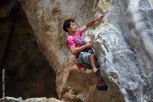 © vitaliymateha, Obraz premium Rock climber climbing up a cliff