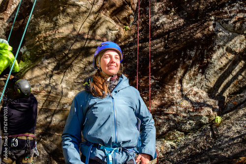© Michael Connor Photo, Naklejka premium Rock climber (young woman, in blue helmet, hardshell jacket, and blue climbing harness) standing in front of a rock face with belay line hanging vertically.