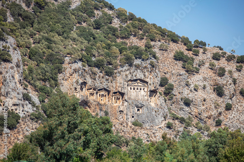 Fototapeta premium Rock-cut temple tombs in Kaunos Dalyan - Turkey (Turkish name; kaya mezarlari) Ancient city of Kaunos, Dalyan valley, Turkey. Kaunos (Latin: Caunus) was a city of ancient Caria and in Anatolia