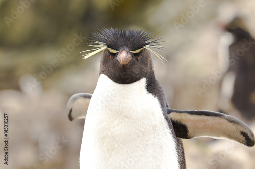© Yori Hirokawa, Fototapeta premium Rock hopper penguin close up. Opening wings.
