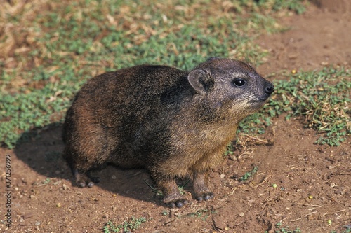 Fototapeta premium Rock Hyrax or Cape Hyrax, procavia capensis, Adult standing on Rock, Hell's Gate Park in Kenya