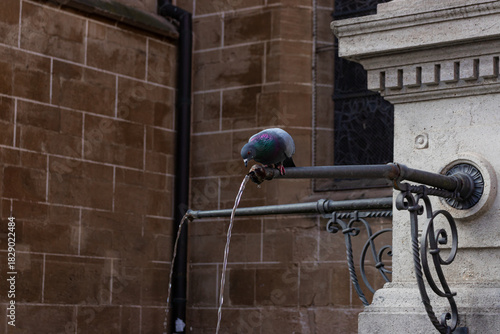 Obraz premium Rock pigeon (Rock dove) with bright colorful neck drinking from water fountain stream spout
