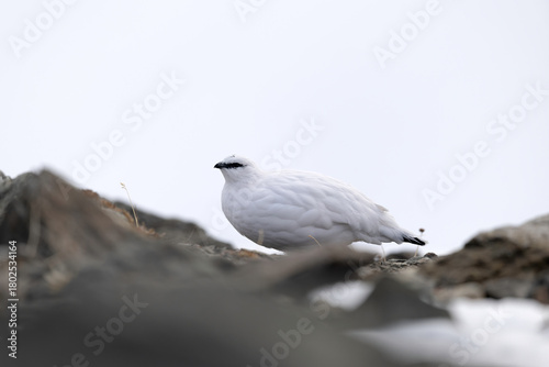 © vinx83, Fototapeta premium Rock ptarmigan resting on alpine rocks in winter, Stelvio National Park
