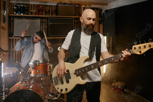 © Nomad_Soul, Fototapeta premium Rock rehearsal or live performance with focus on guitarist playing guitar