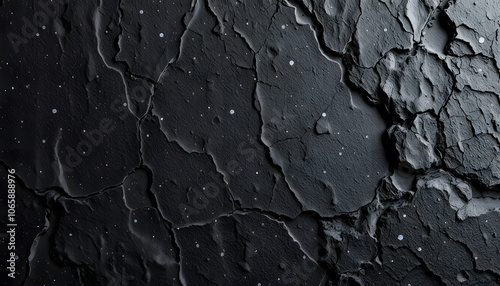 Fototapeta premium Rock texture. Copy space. Dark stone wall. Stone background. Rock surface with holography, nacre. Wall abstraction. Paint spots. Rock surface with cracks. Abstract texture isolated with white highli