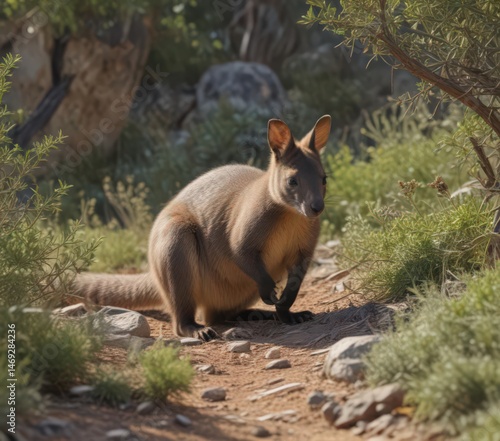 Naklejka premium Rock wallaby grazing amongst sparse vegetation, mammal, vegetation, wildness