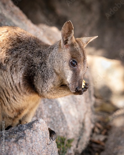 © Wirestock, Fototapeta premium Rock Wallaby perched atop a rocky outcrop at Geoffrey Bay on Magnetic Island in Queensland Australia