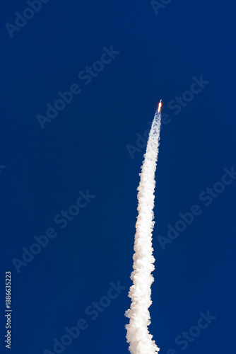 © Parilov, Fototapeta premium Rocket launch against clear blue sky with white trail of smoke