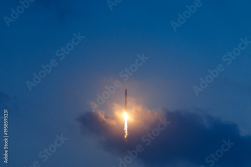 © Parilov, Fototapeta premium Rocket launch against evening sky with dramatic cloud and smoke and flame trail