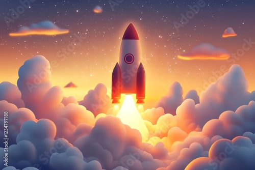 Obraz premium Rocket launch at sunset illuminating clouds with vibrant colors and a magical...