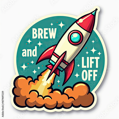 Fototapeta premium Rocket launch beer sticker, retro cartoon, teal and orange, brew humor