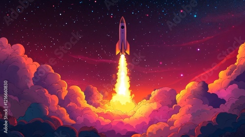 Fototapeta premium Rocket launch into space cosmic sky digital art vibrant environment side view...