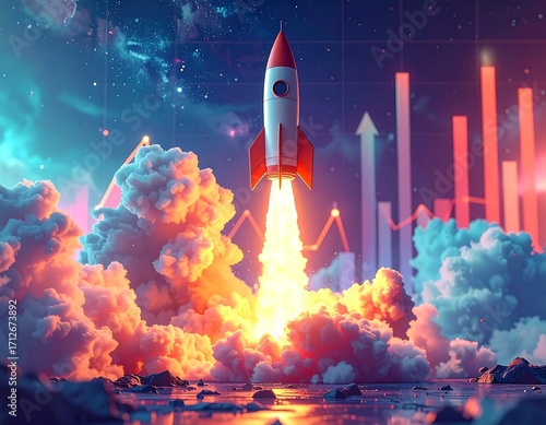 Fototapeta premium Rocket launch into starry night sky, surrounded by clouds and rising stock graphs