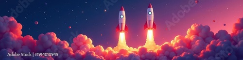 Fototapeta premium Rocket launch, startup team, smoke plume, flat vector style, fire, ambition