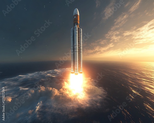 © Batu, Fototapeta premium Rocket Launch Sunrise Over Ocean Clouds