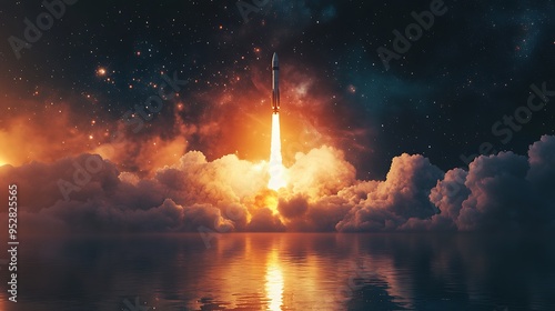 Obraz premium Rocket Launch Through Clouds and Stars at Night