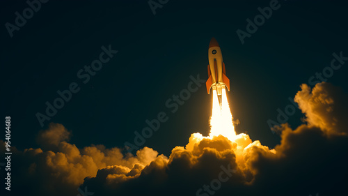 © Tark, Fototapeta premium Rocket launching from clouds at night depicting startup business. Generative AI
