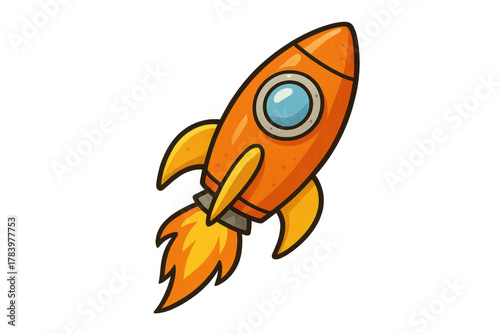 © Sandra, Fototapeta premium Rocket launching icon, cartoon spaceship flying with fire exhaust, adventure, exploration, and startup concept, transparent background