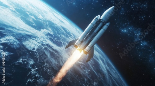 © Karina, Obraz premium Rocket launching into space above the Earth’s atmosphere at dusk